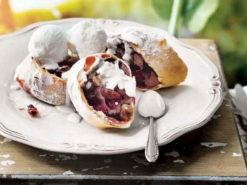 Place the rested dough on a floured counter. Roll out a round and thin dough with the help of a rolling pin. Sprinkle the fruit mixture evenly over the dough with the help of a spoon. Grasp both ends of the dough and wrap it into a roll. Place on a baking tray lined with greaseproof paper. Bake in a preheated 180-degree oven for 20–25 minutes. Take it out of the oven and sprinkle powdered sugar on it while it is hot. Serve warm with whipped cream and vanilla ice cream.