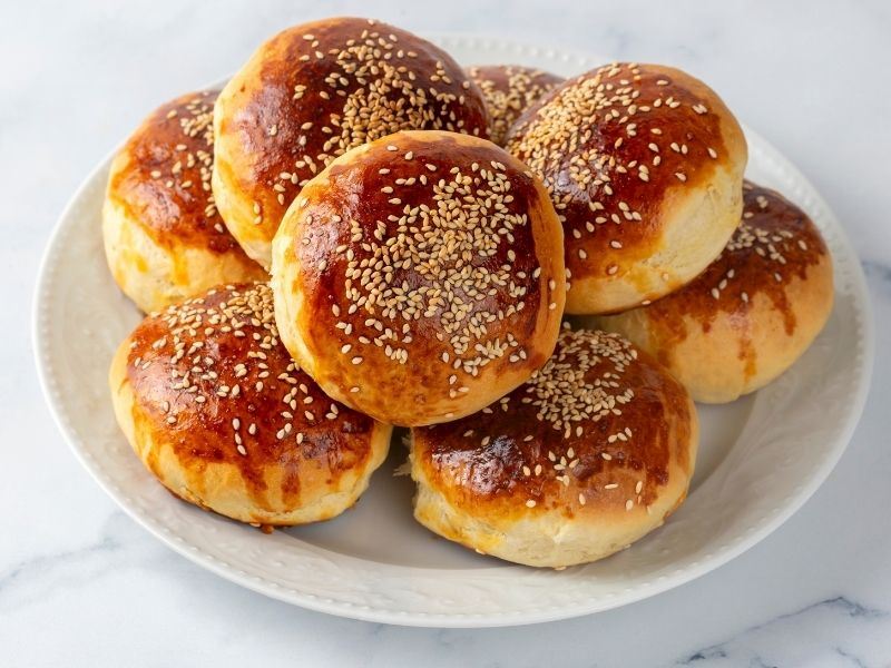 Sunum Tabağı: Poğaçaları sade veya desenli porselen tabaklarda sunabilirsiniz. Beyaz tabaklar, poğaçaların altın rengini ve üzerindeki susamı öne çıkarır.