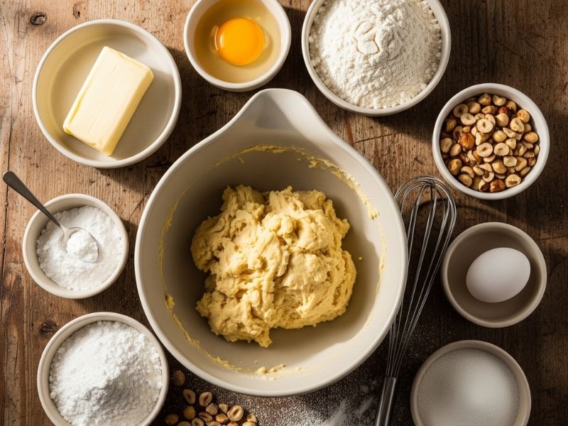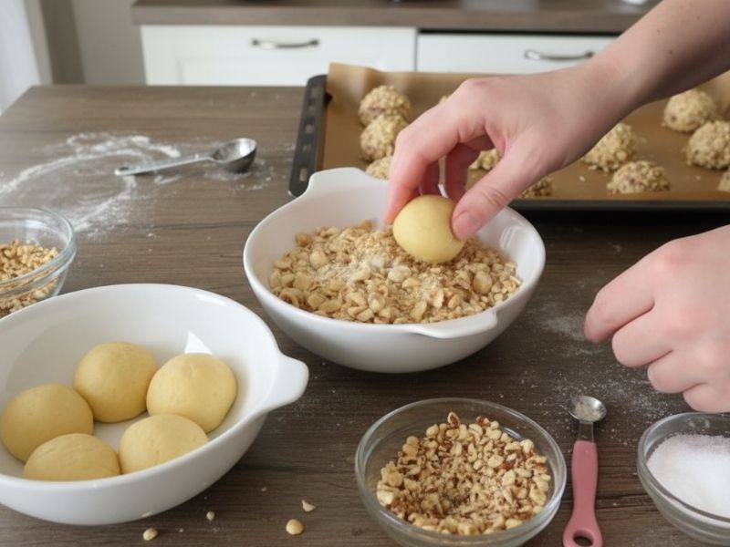 Hamur ele yapışmamalı, ama çok sert de olmamalı. Gerekirse 1-2 tatlı kaşığı un ekleyin. Tereyağı mutlaka oda sıcaklığında olmalı; aksi halde hamur yoğrulurken parçalanır. Kurabiyelerin üzeri hafif pembeleşene kadar pişirin, aşırı pişirmek kurumasına neden olur. Üzerine sürdüğünüz yumurta beyazını çok ince uygulayın; aksi halde fındık ve şekerler tam yapışmayabilir. Fındıkları ince ama iri parçalar halinde dövün, böylece kurabiyeye hem çıtırlık hem de güzel bir doku verir. Kurabiyeler fırından çıkar çıkmaz çok yumuşak olur; soğudukça kıvamını alır.