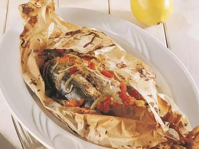 Levrek, patates ve cherry domates ile hazırlanan kağıtta levrek tarifini, bol limonla zenginleştirilmiş bir salata eşliğinde sunabilirsiniz.