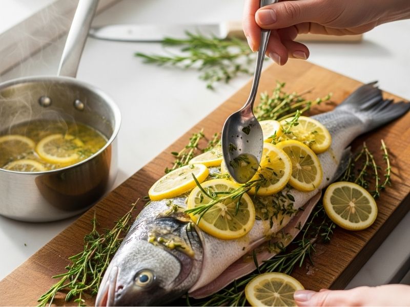 - Yağ ve baharat karışımları: Zeytinyağı, tereyağı veya hafif aromalı bitkisel yağlar, taze otlar ve baharatlarla birlikte kullanıldığında balığa derinlik katar. Örneğin kekik, biberiye, fesleğen ve dereotu ile hazırlanan zeytinyağlı karışımlar, balığın doğal lezzetini öne çıkarır.