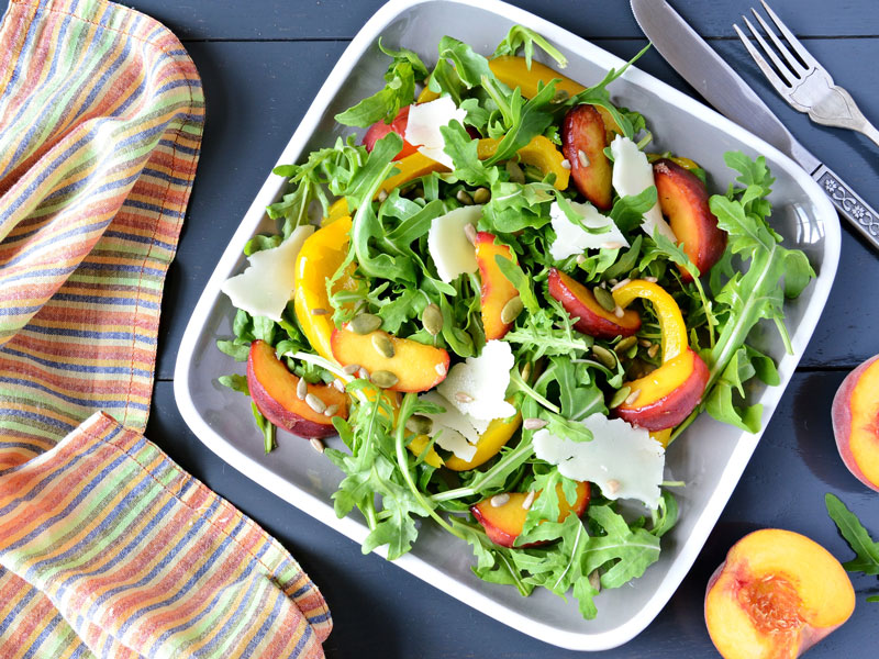 Yapılışı: Şeftaliler dilimlenir. Rokalar yıkanır ve doğranır. Diğer malzemelerin yanına alınır ve karıştırılır. Zeytinyağı, tuz ve balzemik sirke ile hazırlanan sos salataya dökülür. Afiyet olsun.