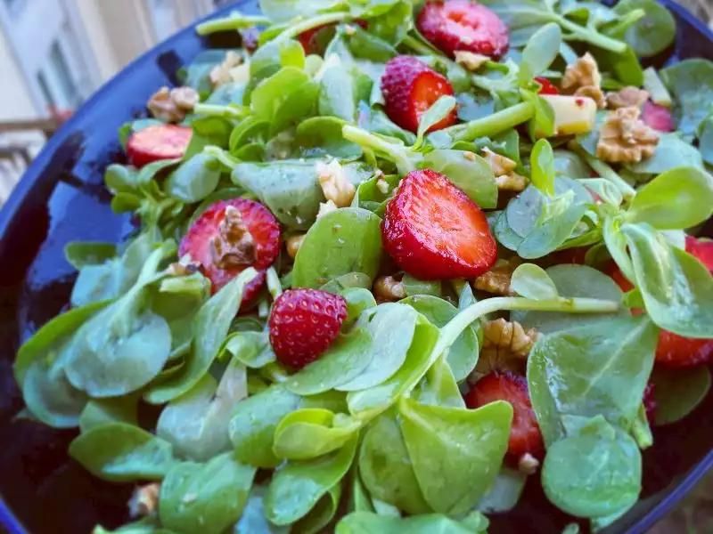 Çilek, ıspanak, kuzu kulağı, yoğurt ve ceviz ile hazırlanan bu salata, özellikle ilkbahar ve yaz aylarında hafif beslenmek isteyenler için önerilir.