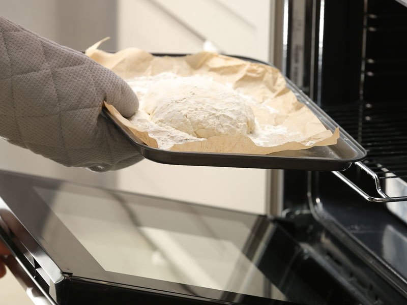 - Tavayı 38 °C sıcaklıktaki fırına koyun. Bu sıcaklık, donmuş hamurun çözülmesi için mükemmel bir sıcaklıktır.