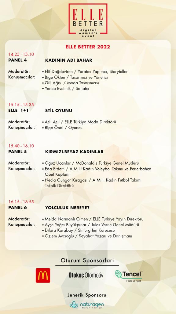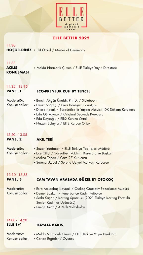 Elle Dergisi'nin düzenlediği etkinlikte ilk panelde sürdürülebilir fikir ve markalara imza atan ekoloji koruyucusu kadınlar bir araya gelecek. Ardından girişimcilik hikayeleriyle ilham veren isimler yolculuklarını anlatacak.