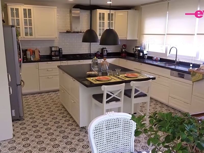 Evin mutfağı oldukça büyük. Yaklaşık 40 metrekarelik mutfakta çok büyük bir ada ünitesi de var. Ev sahibi “Bu ada ünitesini özellikle istedik çünkü eşim de yemek yapmayı çok seviyor. Ferah bir alan olsun istedik. Siyah beyaz ile güzel bir kombinasyon oluşturduk” diyor.