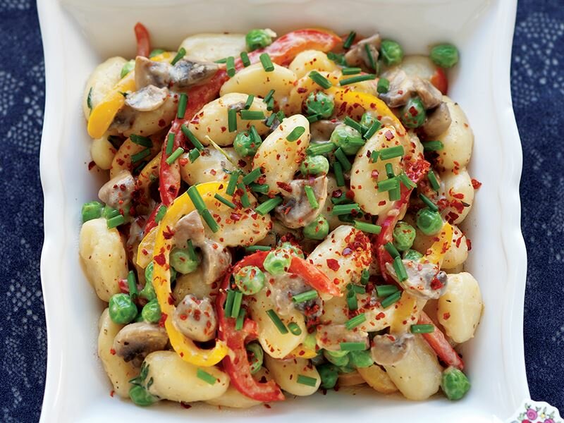 Mantar, kırmızı biber, bezelye, krema ve kekik ile hazırlanan bezelye soslu gnocchi, ortalama 30 dakikada sofralardaki yerini alır.