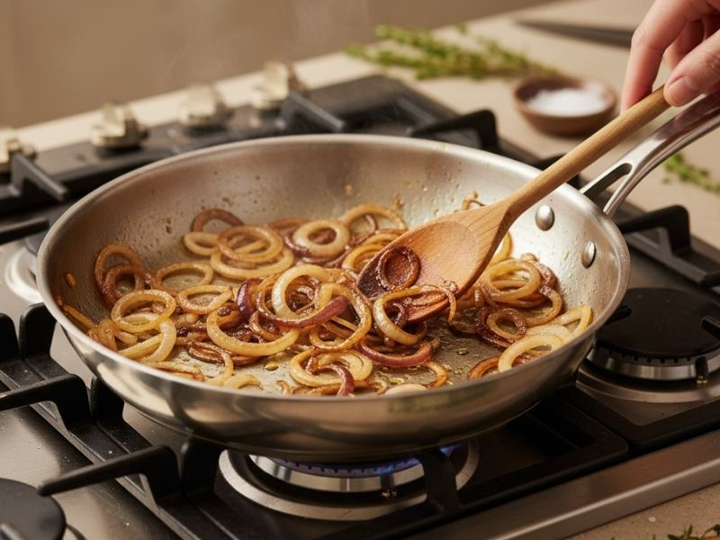 - Isıyı Düşürme ve Sabırla Pişirme: Soğanlar suyunu salmaya başladığında ısıyı kısın. Kısık ateşte, ara ara karıştırarak yaklaşık 25–35 dakika pişirin. Amaç, soğanın içindeki doğal şekerin yavaşça karamelize olmasını sağlamaktır.