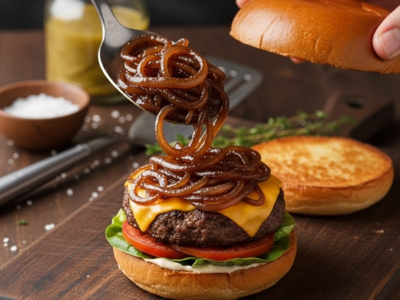 Hamburgerde karamelize soğan, yalnızca tatlılık değil, aynı zamanda derin bir umami aroması katar. Etin yağlı dokusu ve peynirin tuzlu yapısı arasında yumuşak bir geçiş sağlar. İyi hazırlanmış bir karamelize soğan, ne çok sulu ne de yanık olmalıdır; rengi kehribar tonlarında, dokusu kremamsı ve tadı dengeli tatlı–tuzlu bir profilde olmalıdır.