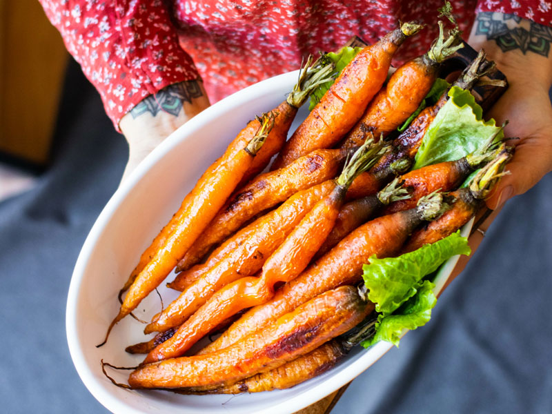 - Havuçları kızartırken karamelize edin. Havuçları kavurma sırasında nemli ve lezzetli tutmak için bolca tereyağı ve dilimlenmiş arpacık ekleyin.