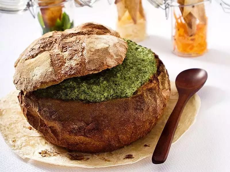 Parmesan peyniri, krem peynir ve ıspanak ile hazırlanan bu tarif, bütün bir ekmeğin içinde sunulur. Ekmek dilimi veya kıtır lavaş eşliğinde tüketilebilir.