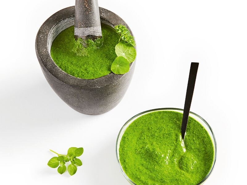 Pesto sosu böyle denemeye ne dersiniz? Avokadolu pesto sos havanda ezilerek hazırlanır. Kahvaltılarınıza lezzet katacaktır.