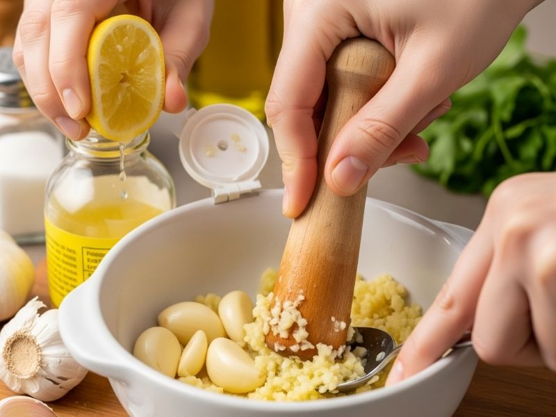 - Sıvıyı ekleme: Limon suyu ve isteğe bağlı olarak sirke ile birlikte 1-2 yemek kaşığı suyu ekleyin. Bu, sarımsağın acılığını dengeler ve sosun kıvamını açar.