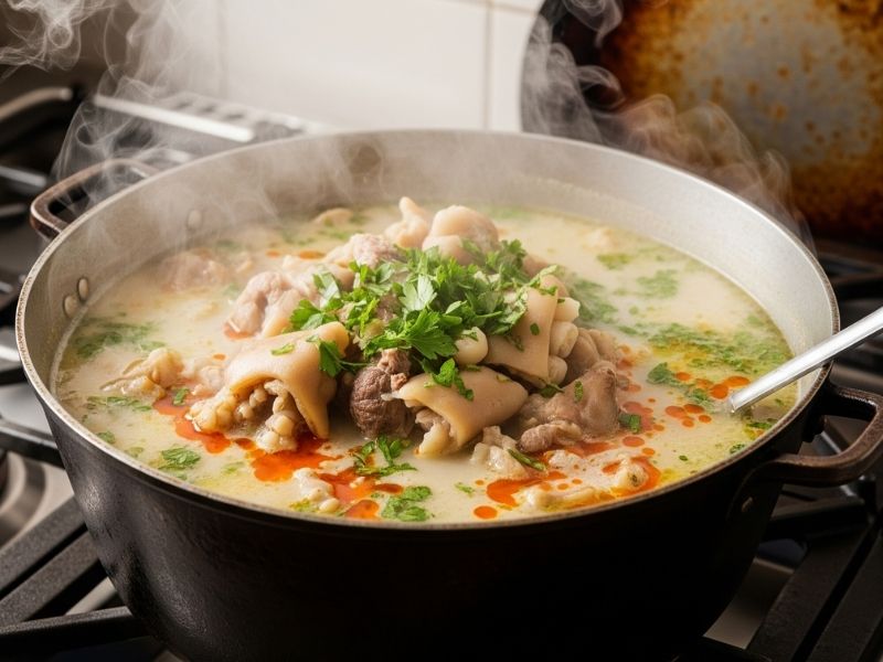 - Suyu ayarlamak: Kaynama sırasında su eksildikçe sıcak su eklemek gerekir. Bu sayede kelle ve paça sürekli su içinde kalır ve kıvam dengesi bozulmaz.