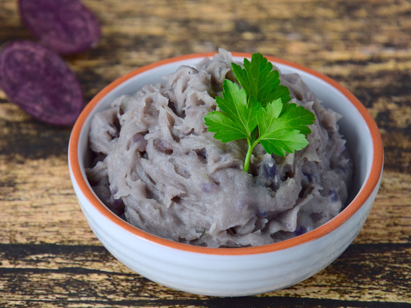 Yapılışı: Pişirmek için mor patatesleri yıkayıp küp şeklinde doğrayın. Patatesleri büyük bir tencereye koyun ve patatesleri kaplayacak kadar su dökün. Tencereyi patateslerle birlikte ocağa koyun ve orta-yüksek ateşte kaynama noktasına gelene kadar pişirin. Patatesler çatalla yumuşayana kadar yaklaşık 15 dakika pişirin. Patatesleri boşaltın ve tencereyi ocağa geri koyun. Sıcak süt, tereyağı ekleyin ve tuz ekleyin. Bir patates ezici kullanarak, istediğiniz kıvama gelene kadar patatesleri ezin.
