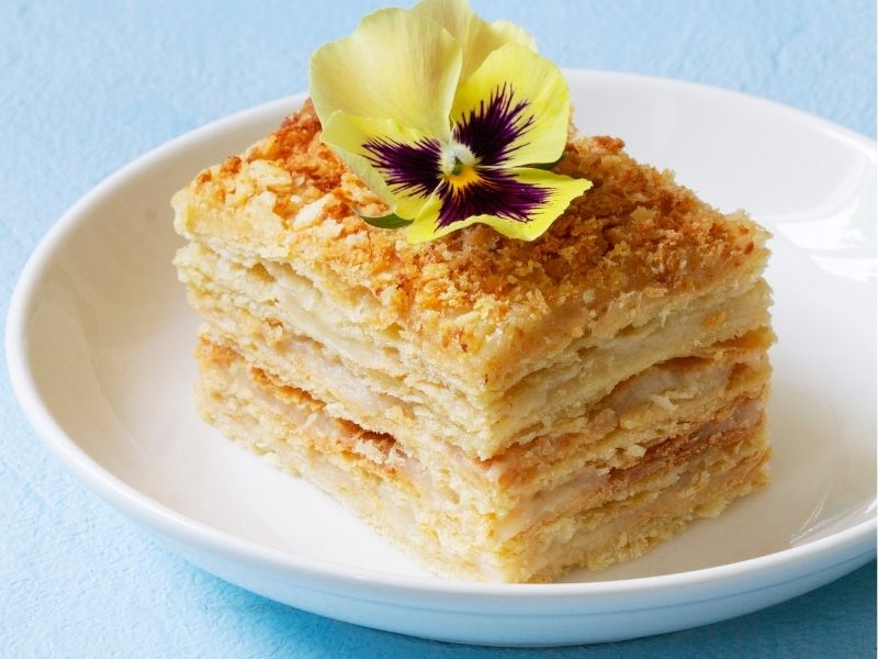 - Hamur katlarını önceden 180–200 °C’de altın rengi alana kadar pişirmek gerekir. Çok pişirmekten kaçının; hafifçe altın rengi alan hamur katları daha sonra kremayla birleşince ideal dokuyu verir.