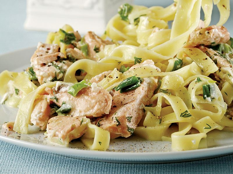 Somonu yalnızca sebzelerle değil, makarnalarla birlikte de sunabilirsiniz. Yalnızca 30 dakikada hazırlanan somonlu kremalı makarnayı, dereotu ve limon suyu ile tatlandırabilirsiniz.