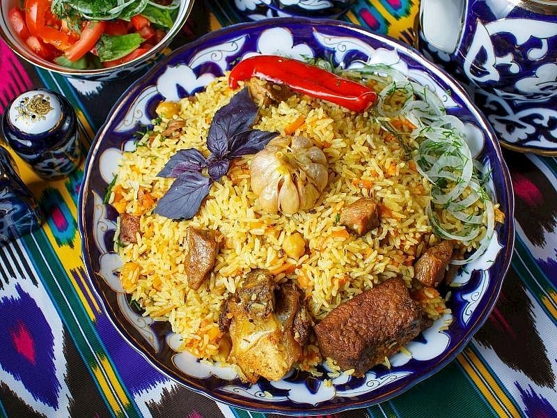 Pilavın pişme aşamasının ortasında, harcın tam merkezine kabukları soyulmadan bütün olarak yerleştirilen sarımsak, Özbek pilavının imza dokunuşudur. Sarımsak, keskinliğini kaybederek yemeğe sadece hafif ve iştah açıcı bir koku bırakırken, piştikten sonra tereyağı kıvamına gelerek servis anında özel bir gurme detay sunar. Pirinçlerin üzerine su eklendikten sonra tencerenin kapağının sıkıca kapatılması ve çok kısık ateşte pişirilmesi, buharın içeride hapsolmasını sağlar. Pişme işlemi tamamlandıktan sonra tencerenin üzerine kağıt havlu veya temiz bir bez konularak yapılan uzun süreli demleme, pilavın nemini çekerek tanelerin oturmasına yardımcı olur. Bu sabırlı bekleyiş, pilavın tüm aromalarının birbiriyle bütünleştiği ve o meşhur lezzet patlamasının oluştuğu son aşamadır. Demlenen pilav, nazikçe alttan üste doğru karıştırılarak servis edilmeye hazır hale getirilir.