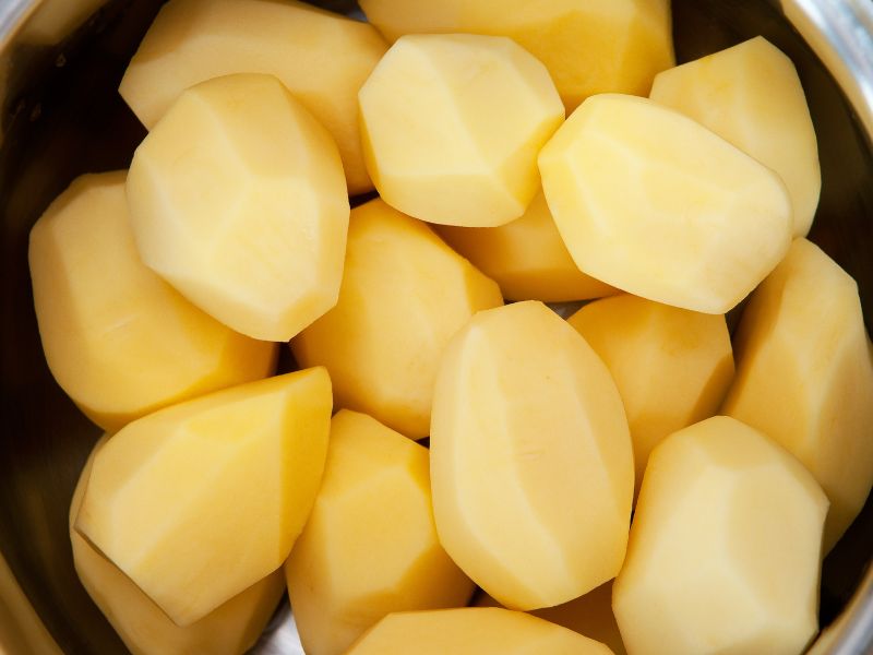 Patateslerin kabuklarını soyduktan sonra, eşit bir şekilde pişmesi için mutlaka aynı boyda doğramanız gerekir. Tabi ki hepsini tek tek ölçmek çözüm değil. Ancak göz kararına göre uzunluk ve kalınlıklarının aynı olmasına çok dikkat edin. Bu sayede hepsi eşit zamanda pişecektir.