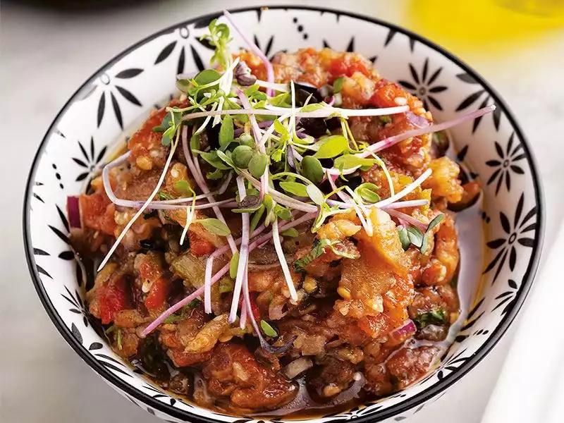 Patlıcan, kırmızı biber ve maydanoz ile hazırlanan bu salata, yemeklerin yanına çok yakışır. Porsiyonu yaklaşık 35 kalori değerindedir.