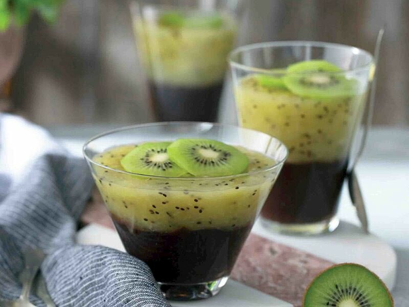 Kivi ve portakallı pelte ile hazırlanan bu tatlı, çikolatalı puding ile birlikte sunulur. Tatlı kaplarının alt kısmı puding, üst kısmı pelte ile doldurulduktan sonra, üzeri mevsim meyveleri ile süslenir.