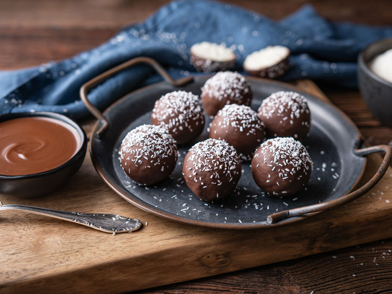 Yapılışı: Hindistan cevizi ile sütü karışıtın. Toplar haline getirerek soğumaya bırakın. Soğuyan topları benmaride erittiğiniz çikolataya batırın ve soğuduktan sonra servis edin. Yoğunlaştırılmış süt yerine krema ile balı çırpabilirsiniz ya da labne, krem peynir karışımı ekleyebilirsiniz. Afiyet olsun.