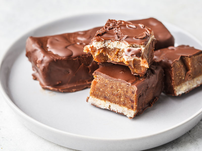 Yapılışı: Bir tepsiye ya da kaba yağlı kağıt serin. Hurmaları yumuşamaları için su içerisinde bekletin. Hurma ve kuruyemişleri blenderdan geçirerek yağlı kağıt üzerine serin. Bitter çikolata eritin. Hurmalı karışımı soğutun ve dilimleyin. Bitter çikolataya bulayarak servis edin. Afiyet olsun.