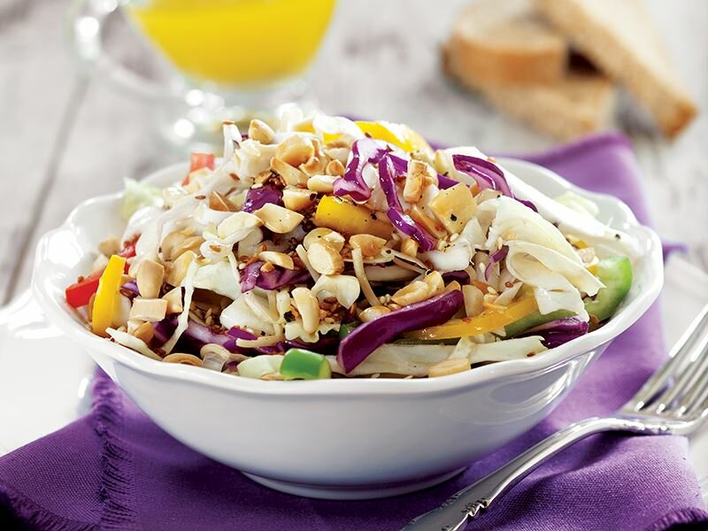 Yapılışı: Sosu hazırlamak için bir blender veya mutfak robotunda portakal suyu, limon suyu, susam yağı, fıstık ezmesi, soya sosu, kırmızı biber ve zencefili ekleyin. Pürüzsüz olana kadar karıştırın kenara koyun. Büyük bir kapta mor lahana, beyaz lahanası, havucu karıştırın. Sosla harmanlayın ve doğranmış fıstıkları serpin ve servis yapın.