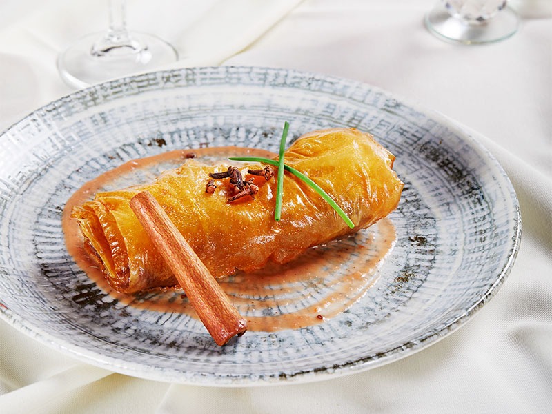 Yapılışı: Sosu hazırlamak için kırmızı eriği 4-5 parçaya bölerek kısık ateşte 1 çay bardağı su ile kaynatın. Kaynayan karışıma tarçın, karanfil ile 1 yemek kaşığı tereyağı ekleyin ve el blenderı’ı ile çekin. Soğanı karamelize ettikten sonra kuzu tandıra ilave edin ve mantarı ekleyin. Son olarak taze kekik, karabiber ve tuzla tatlandırın. 1 adet baklava yufkasına, hazırladığınız kuzu tandırlı harcı koyun ve paçanga böreği tarzında sarın. Tüm yufkalara aynı işlemi uyguladıktan sonra zeytinyağında kızartın. Servis tabağının zeminine önce erik sosunu yayın ve üzerine kızarmış çıtır böreği koyarak servis edin.