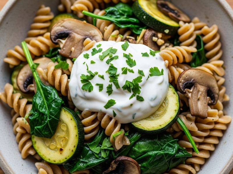 Tam Buğdaylı Sebzeli Makarna – Yoğurt Soslu