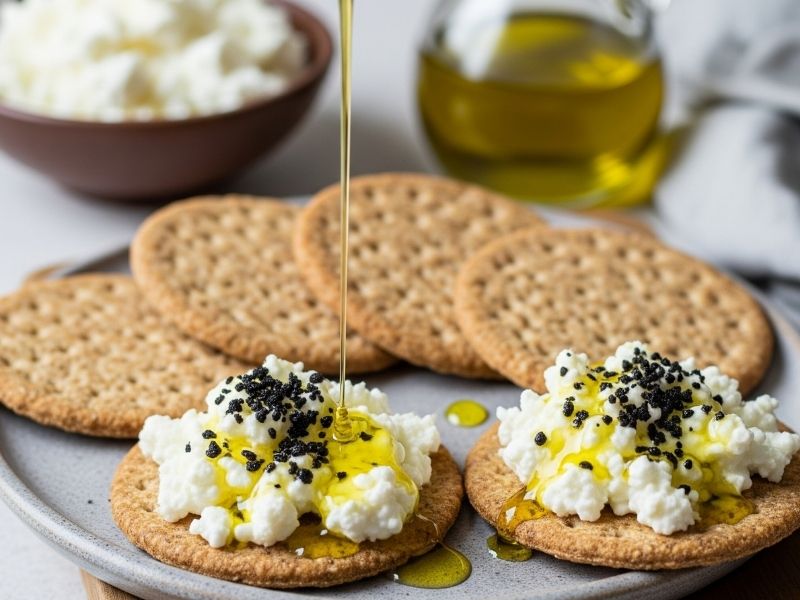 Krakerlerin üzerine lor peyniri sürün, biraz çörek otu serpip servis edin.