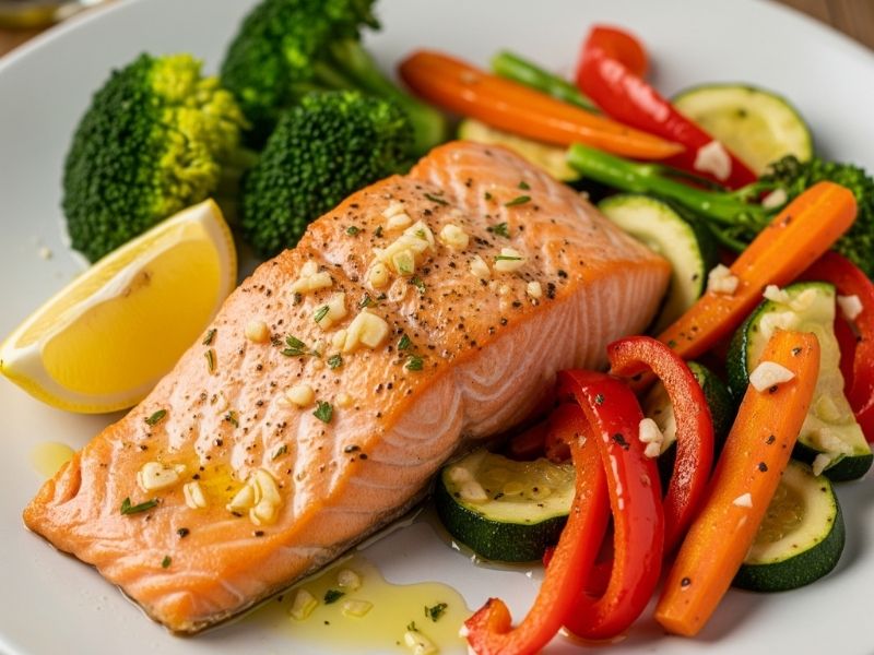 Sebzeleri doğrayın, somonla birlikte fırın tepsisine koyun. 180°C’de 20 dk pişirin ve servis edin.