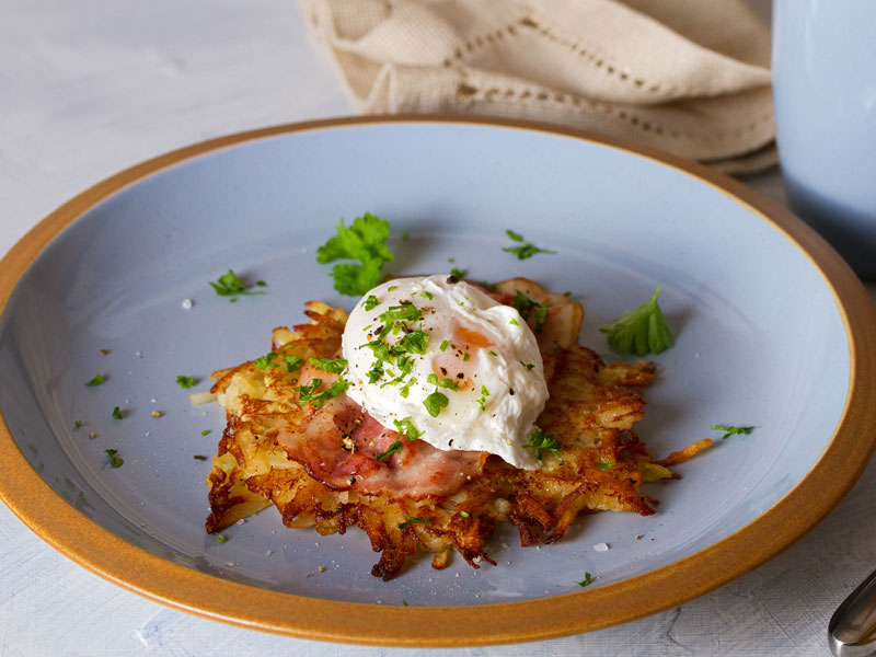 Yapılışı: Fırını 100 derecede ısıtın. Büyük bir kapta rendelenmiş ve/veya doğranmış sebzeleri tuzla birlikte atın. Temiz bir mutfak havlusunun ortasına koyun, uçlarını toplayın ve mümkün olduğunca fazla nemi çıkarmak için sıkarak birlikte bükün. 2 yumurtayı kasede çırpın, ardından sıkılmış sebzeleri karıştırın. Patatesleri bir kutu rendenin büyük deliklerine rendeleyin ve başka bir büyük kaseye koyun. Soğuk su ekleyerek nişastaları çıkana kadar bekletin. Rendelenmiş patatesleri havluda bükün ve fazla nemi sıkın. Sebzelerle birlikte kaseye ekleyin. Un ve baharatları ekleyin. Orta-yüksek ısıda büyük bir yapışmaz veya dökme demir tavada 2 yemek kaşığı yağı ısıtın. Porsiyonlara ayırarak tavaya dökün ve arkalı önlü pişirin. Röstiyi bir fırın tepsisine aktarın ve fırında sıcak tutun. Kalan 2 yemek kaşığı yağ ve sebze karışımı ile tekrarlayın. Yumurtaları sıcak suda poşeleyin. Sebzeler ile birlikte servis edin. Afiyet olsun.