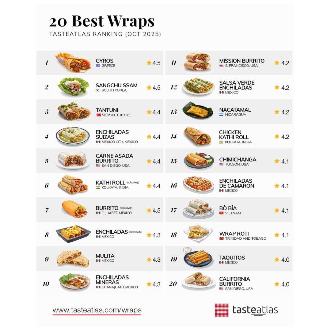 Taste Atlas’ın hazırladığı bu liste, Meksika ve Amerika mutfaklarının ağırlıkta olduğu bir sıralama sunsa da, Türk mutfağının temsilcisi Tantuni’nin dünya çapında ilk üçte yer alması ile öne çıktı. Baharatlı dana veya tavuk etinin ince lavaş arasında servis edildiği Tantuni, hem lezzetiyle hem de pratik sunumuyla dünya damaklarında iz bırakmaya devam ediyor.