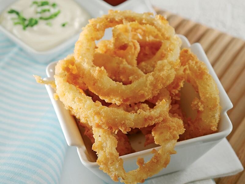 Soğan halkası, özellikle çıtır tavuk kanatlarının yanına çok yakışır. Bir sos ile birlikte de tamamlayarak servis edebilirsiniz.