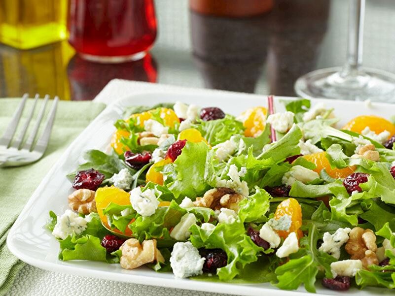 Rokfor peyniri, portakal, ceviz ve Akdeniz yeşillikleri ile hazırlanan bu salata, düşük kalorisiyle diyet listeleri için de uygundur. Ana yemeğin yanında sunulabilir.