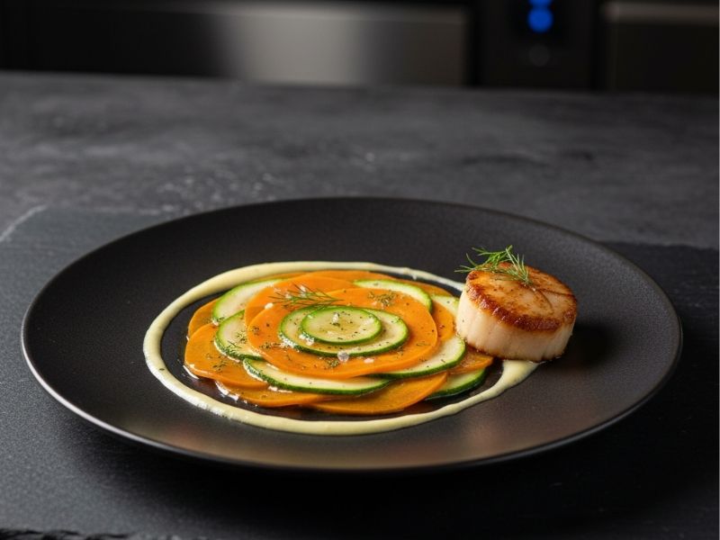 - Renkli sebzeler (örneğin havuç ve kabak) birlikte vichy doğranarak tabakta görsel kontrast yaratabilir.