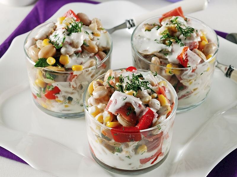 Barbunya, mısır, jambon, biber ve mantar ile hazırlanan bu salata, farklı malzemelerin karışımından oluşur. Sosla buluştuktan sonra salata kaselerine paylaştırılarak afiyetle tüketilir.