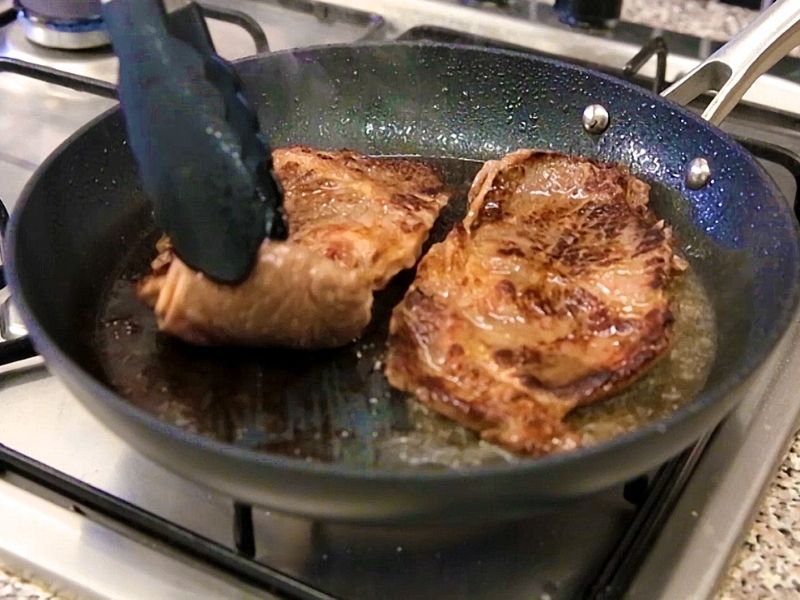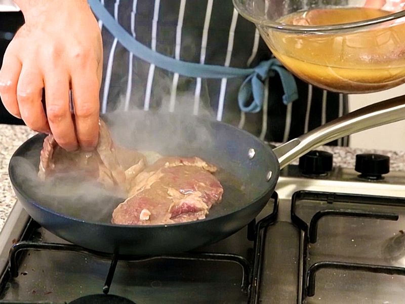 Et maşa yardımıyla sostan çıkartılır ve ısınan tavaya alınır. Yüksek ateşte mühürlenmesi için arkalı önlü kızartılır.
