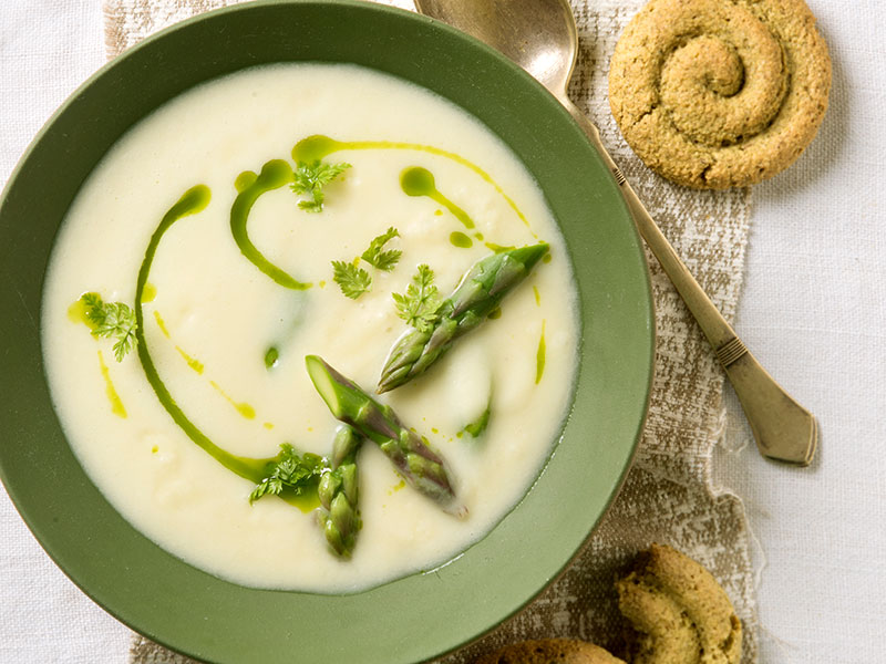 Yapılışı: Kerevizi, rezeneyi ve havucu küp küp doğrayıp zeytinyağında hafif soteleyin. Maydanoz, tarhun, mercanköşk ve kekik baharatlarını ekleyin. Sebze suyunu ve domates sosunu ekleyin ve 30 dakika pişirin. Hepsini karıştırın ve soğutun, keten tohumu yağı ve biraz ekşi krema ve taze fesleğen ile ekleyerek sunun.