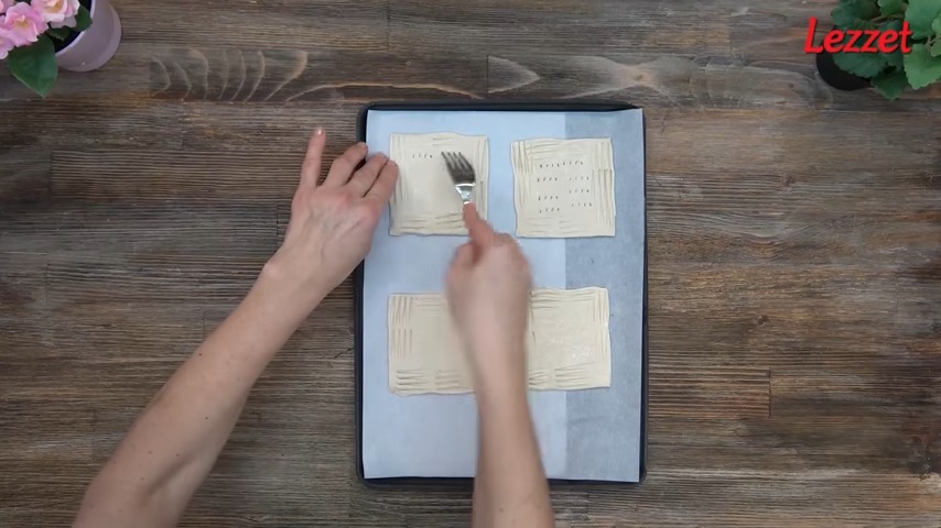 Milföylerin 4 tanesini yağlı kağıt serdiğiniz tepsiye yerleştirin. Diğer 4 tanesinin orta kısmını kare şeklinde kesip çerçeve oluşturun ve diğer milföylerin üzerine yerleştirin.