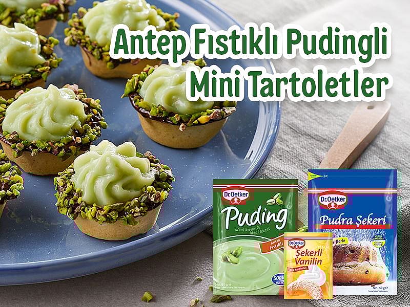 Kendisi minik, lezzeti büyük! Kıtır mini tartoletlerin üzerine Dr. Oetker Antep Fıstıklı Puding dolgusu ve çikolata-fıstık kaplamasıyla enfes bir uyum yakalayacağınız tarifimiz için: