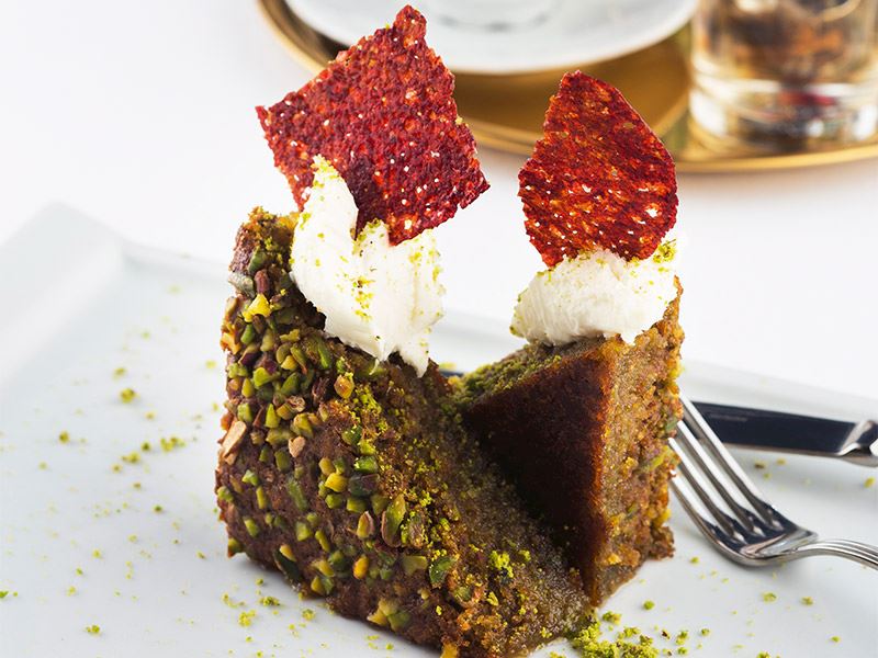 Son olarak toz fıstığı ekleyin ve karışımı fırın tepsisine alın. Üzerine pirinç fıstığı serpin ve önceden ısıtılmış 160 derecedeki fırında 30 dakika pişirin.
