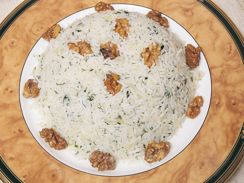 Pilavı harmanlayıp büyük bir tasa doldurun ve ters çevirerek düz servis tabağına alın. Üzerini ve çevrisini yarım ceviz içleriyle süsleyip sıcak olarak servis yapın.