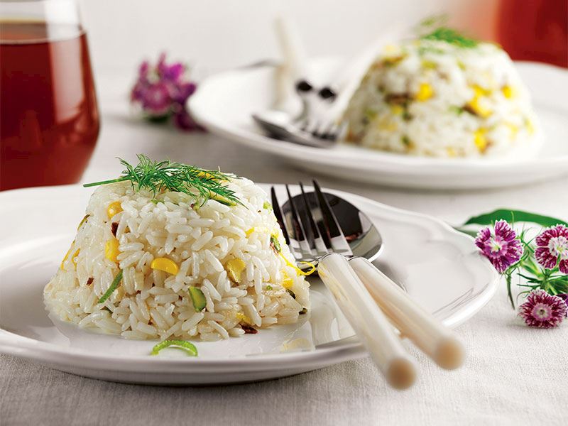 - Antep fıstığı, konserve mısır, rendelenmiş limon kabuğu ve yasemin pirincini ilave edip pirinçler şeffaflaşıncaya kadar kavurup sebze suyunu ilave edin. Tuz ile tatlandırıp pirinçler göz göz oluncaya kadar pişirin.