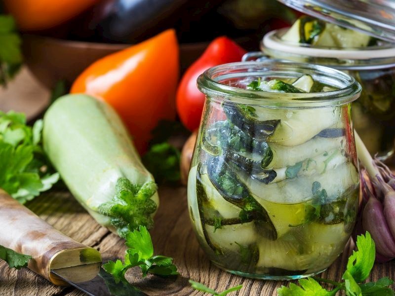 Sterilize edilmiş kavanozlara doğranmış kabakları, sarımsakları, dereotunu ve isteğe bağlı baharatları ekleyin.