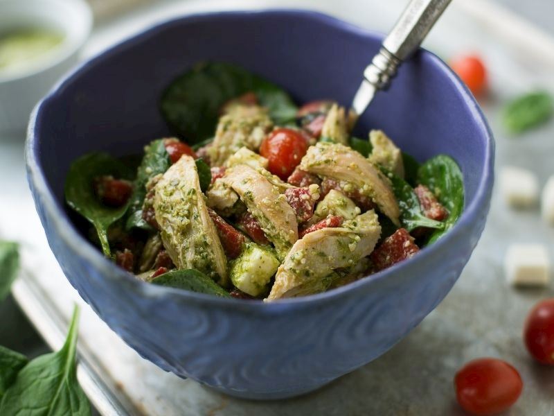 Bir porsiyon pesto soslu tavuk salatası 380 kaloridir.