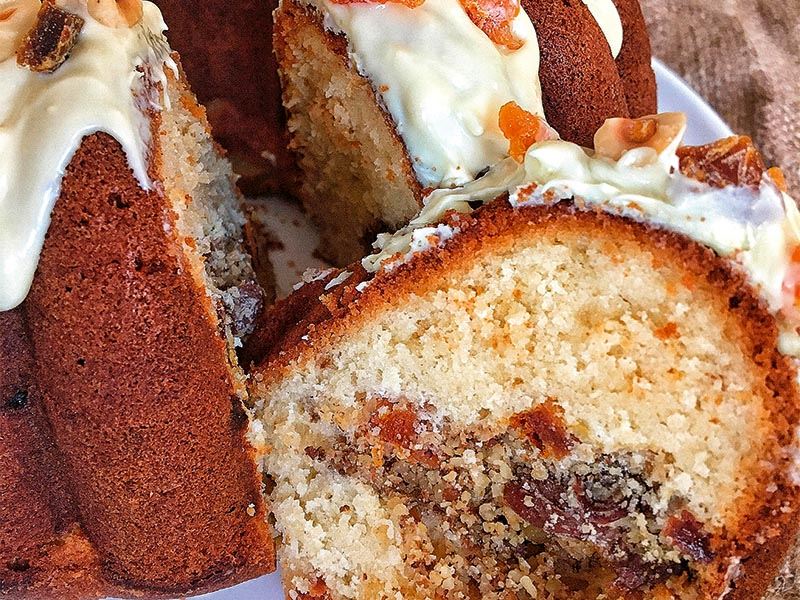 Üzeri için beyaz çikolatayı benmari usulü eritin ve kekin üstüne yayın. Kuru üzüm kuru kayısı ve fındık parçalarıyla süsleyerek servis edin.