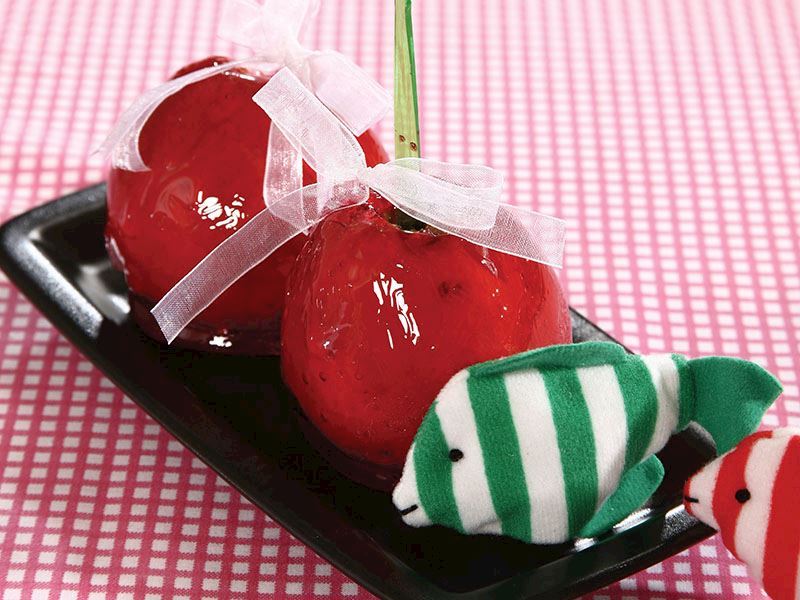 - Elmaları kırmızı sosa batırıp fazlasını tencerenin kenarından süzün. Yağlı kağıt serili tepsiye yerleştirin. Kalan elmalara da aynı şekilde şekerle kaplayın.