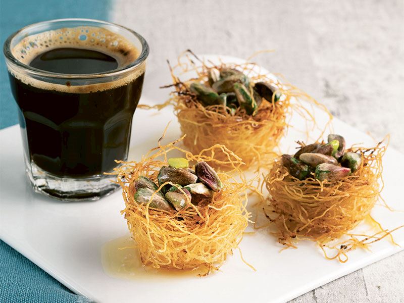 Kuruyan kadayıfların üzerine kaşıkla eritilmiş tereyağını dökün ve önceden ısıtılmış 180 derecedeki fırında kadayıflar kızarıncaya kadar yaklaşık 15 dakika pişirin.